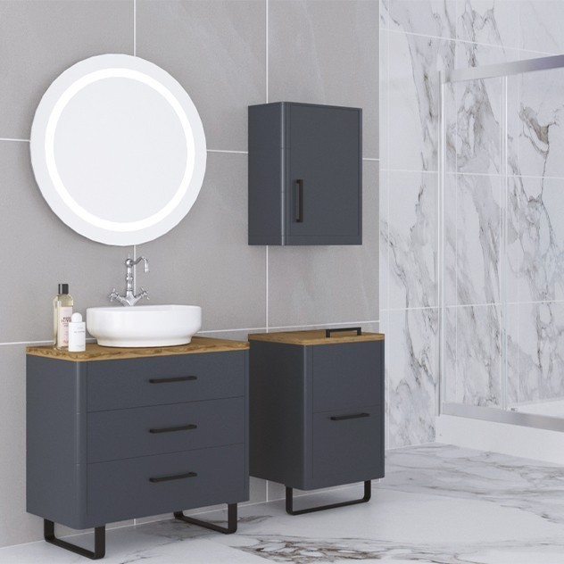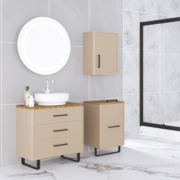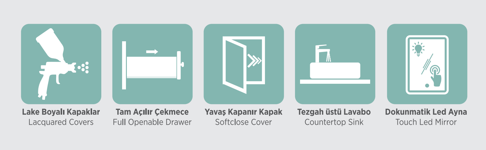 Liya; modern tasarım çizgileri ve tezgah üstü uyumlu lavabosuyla banyonuza estetik katar. Lake boyama yüzeyi ile banyonuzun ıslak hacimlerini parlaklığıyla tam uyum sağlar. Geniş çekmeceli iç hacimi, dekoratif ayak yapısı ve üst açılır pratik boy dolabı ile fonksiyonel kullanım sağlar.